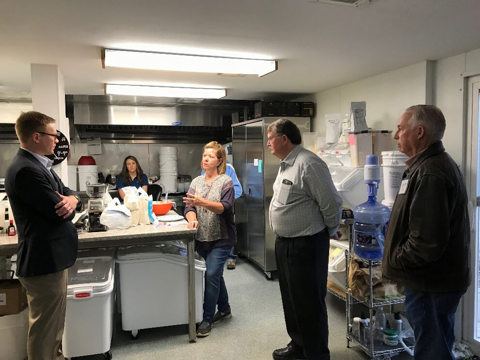 “If you can solve a problem, you can create a business.” -Earl Roemer, President at Nu Life Market The first stop was at Nu Life Market LLC, a company in Scott City that thrives through cutting edge innovation in the field of agriculture. Their ability to utilize sorghum grain (or milo) to create value-added, in-demand products has made them a leader in several emerging markets and also creates more opportunities for Kansas farmers to grow this popular, low water-use crop and sell that product closer to home. “Producers want to plant sorghum, but we need markets to sell to,” added State Representative—and Kansas farmer—Don Hineman, who joined the Secretary for the Scott City tours. “This company is working on that,” said Hineman. The food and milling science experts at Nu Life Market have utilized sorghum grains to develop high quality gluten-free flour that can be used in a wide array of products that consumers are currently demanding. The products have the additional advantage of being totally non-GMO as well as dairy free, soy free and peanut free. Their extra attention to food safety has allowed their products to be certified safe for consumers with those food allergies, and their innovation has greatly improved the quality and options available for consumers in that market. “The biggest asset here is the people we have brought in to innovate and help this operation grow,” said Roemer. Partnerships with Kansas research institutions have also helped, through grants and other funding for research and development. All those factors together have made Kansas the perfect place for this business to take off. “We’re on the forefront of this, through science and innovation,” Roemer said. Nu Life is currently exporting to 15 different countries and passing along those profits to producers here in Kansas. Their innovative flour is heading to Italy to produce gluten-free pasta for consumers around the world. They also supply product used to produce the popular Chinese liquor, baijiu, and ship huge amounts of their value-added grain to the global beer giant, Heineken. In addition to establishing strong industry connections around the state and globe, the leadership at Nu Life have found Scott City an exceptional environment to start and grow their business. “Buy-in from the community is critical,” said Roemer. The company’s proximity to sorghum producers, coupled with an active economic development presence, has allowed Nu Life to launch and thrive in Scott City. “Special people can make a difference in an industry, it just so happens we have them here,” said Roemer.