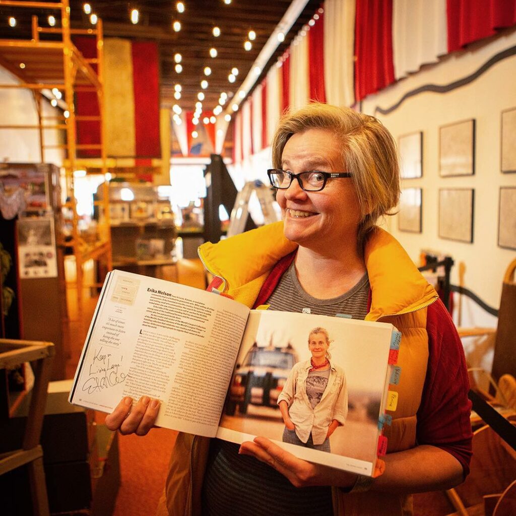 While living in a vehicle for two years, she explored the nooks and crannies of the United States seeking out the odd and unusual, gathering stories of people who build Outsider Art Environments, as well as Roadside Vernacular Architecture known as World’s Largest Things.