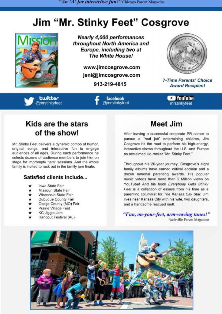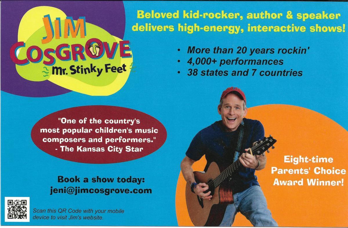For more than two decades, award-winning kid rocker Jim “Mr. Stinky Feet” Cosgrove has delighted audiences throughout North America and Europe with his energetic brand of family-folk-rock. With more than 4,000 performances in 38 states and 7 countries (including two at the White House), eight award-winning albums, and over two million YouTube views, he’s become a reliable favorite on the family music tour circuit. Prior to finding his true calling, Cosgrove worked as a media spokesperson for Sprint Corporation, an editor for Hallmark Cards, and a feature writer for the Albuquerque Journal. He is the author of “Everybody Gets Stinky Feet,” a collection of essays from his time as a parenting columnist for The Kansas City Star.