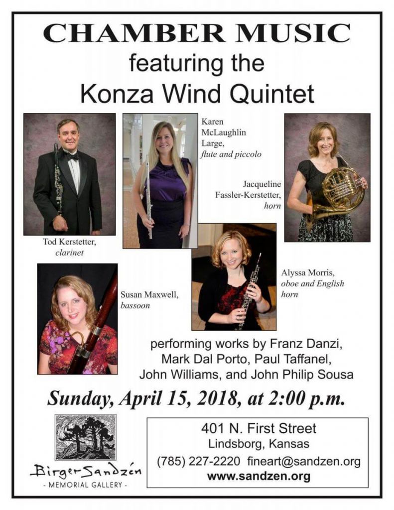 The Konza Woodwind Quintet of Kansas State University is an active touring and teaching and performing group. It includes Dr. Kristyn Son- flute, Dr. Alyssa Morris- oboe, Dr. Tod Kerstetter- clarinet, Dr. Jacqueline Kerstetter- horn and Dr. Susan Maxwell- bassoon.